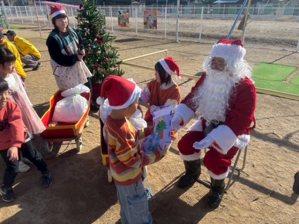 真備地区内の認定こども園2園にメンバーがサンタクロースに扮して園児たちにプレゼントを贈・・・