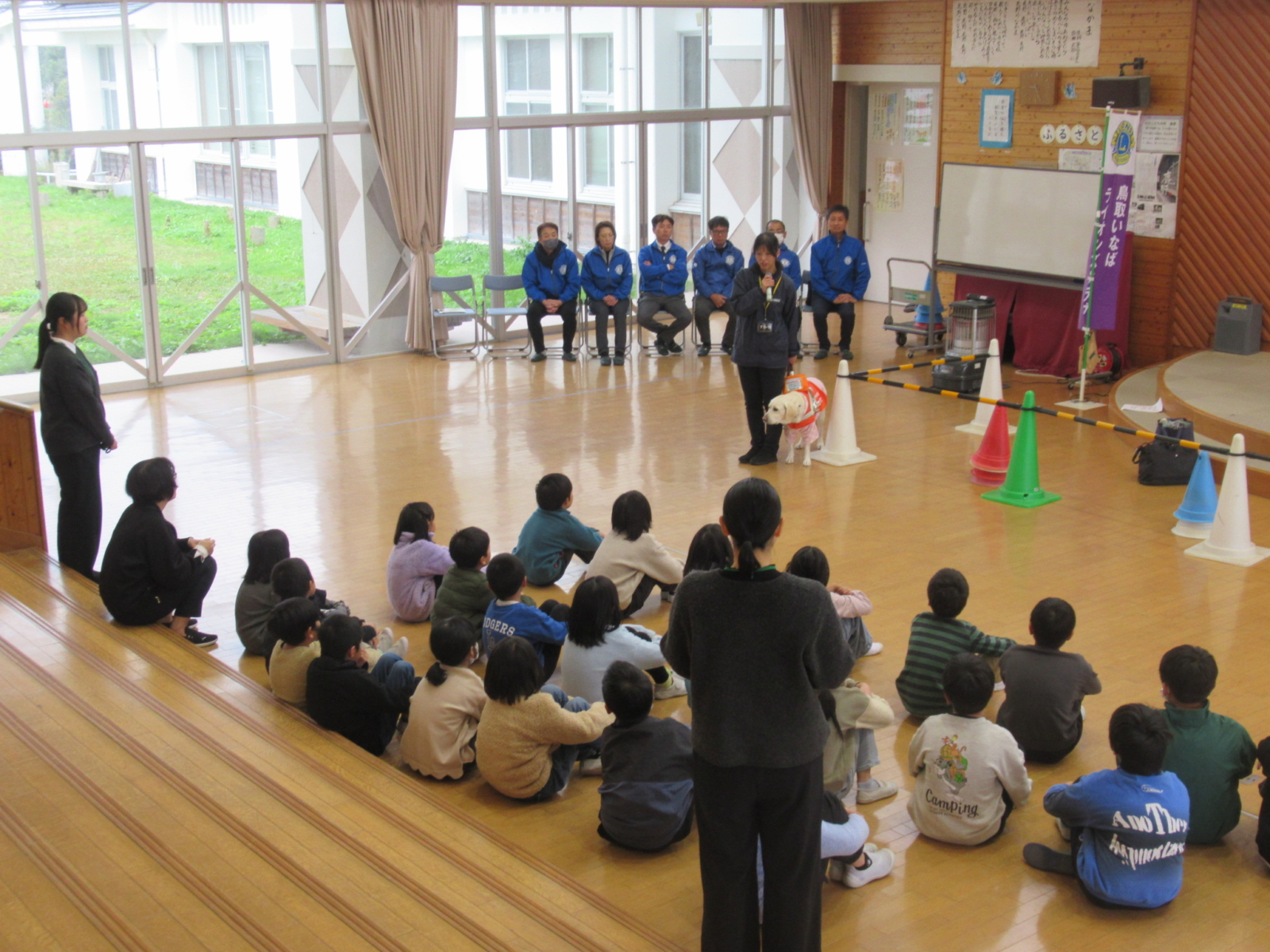 視覚障害のある方は①点字と白杖を使い歩くこと、②目の見える人に付いて歩くこと(手引き)、そして、③盲導犬に付いて歩くことの3つの方法があるとのことでした。。しかし盲導犬も行き先まで案内してくれるわけではなく、信号の判断もわからないと説明がありました。普段の生活の中で視覚障害の方と出会う機会は少ないと思いますが、もし出会うことがあれば積極的に声を掛けて、困っていることがないか聞くようにとの話でした。全国に視覚障害のある方が30万人、対して盲導犬は800頭ということで、支援が足りていない状況です。また、盲導犬への理解がまだまだ足りていないのが現状です。今回の事業を実施することで社会の関心を呼び視覚障害について世の中に知っていただければよいと思います。参加されたライオンズメンバー、学校関係の方に深く感謝いたします。