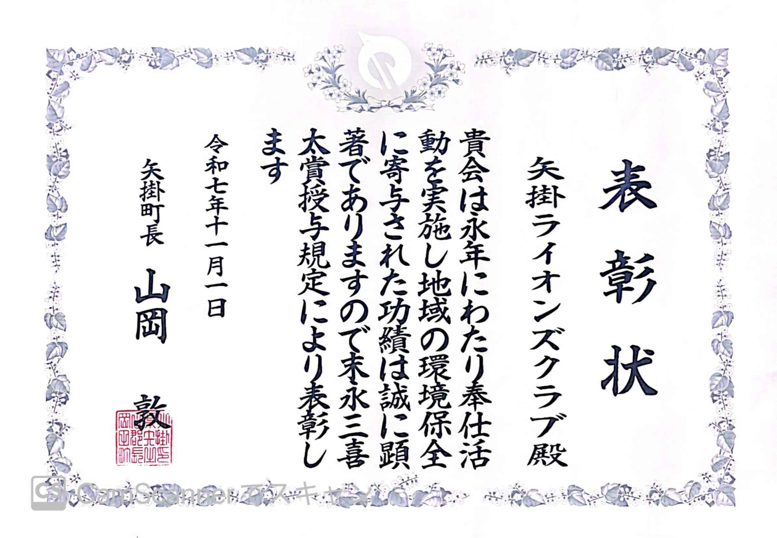 令和7年度「協働のまちづくり表彰式」において、矢掛ライオンズクラブが地域への奉仕活動に対し表彰を受けました。