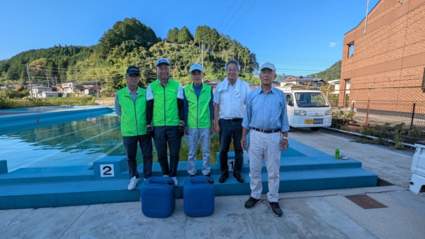 今年で20回目となる小・中学校8校のプールへ EM液1,000リットル投入を会員4名で・・・